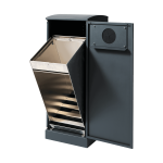 Die Öffnung der beiden Einlagen ist mit einer Matte mit sternförmigem Schnitt ausgestattet. Dieser sichtbare Einschnitt in der Einlage trägt zusammen mit einem sichtbaren Piktogramm zu einer korrekteren Sortierung der Pfandverpackungen bei. Der integrierte Einsatz im Abfallbehälter wird herausgekippt, wenn der Behälter geleert werden muss. Der stabile Beutelhalter am Einsatz ist quadratisch gestaltet und sorgt dafür, dass der Beutel an Ort und Stelle bleibt. Unter dem kippbaren Einsatz ist eine große Tropfschale angebracht, die überschüssige Flüssigkeit auffängt, die bei der Sortierung entstehen kann. Die Tropfschale kann herausgenommen und gereinigt werden. Durch die vier vorbereiteten Löcher an der Seite kann der Abfallbehälter mittels Schrauben mit gleichartigen Behältern verbunden werden.