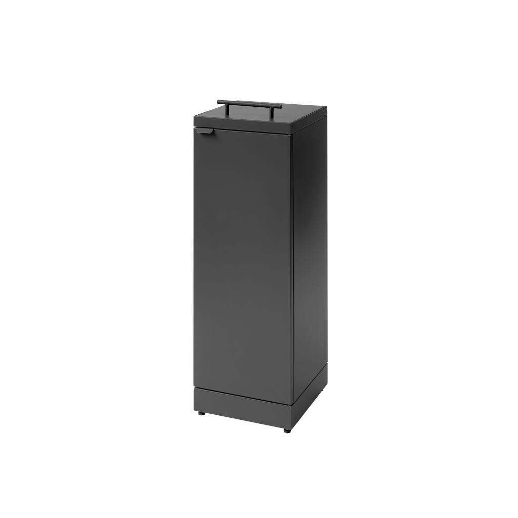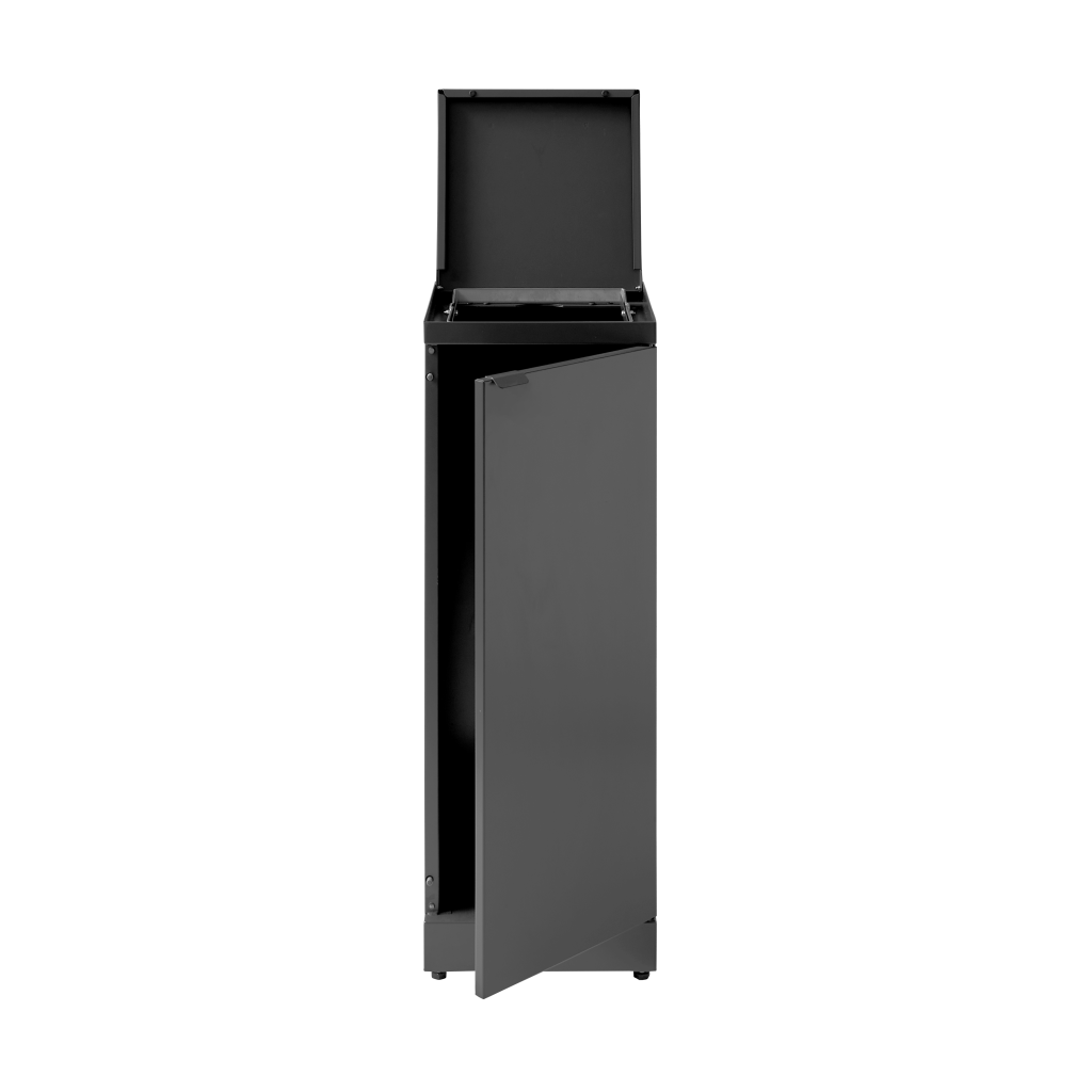 Für eine ergonomisch korrekte Entleerung ohne schweres Heben ist der Abfallbehälter mit Fronttüren mit Soft Close ausgestattet. Der Abfallbehälter ist mit einem integrierten und stabilen Beutelhalter ausgestattet, damit der Beutel an Ort und Stelle bleibt. Der Deckel verbirgt auch den Beutel, sodass der Abfallbehälter ein stilvolles Design behält. Der Abfallbehälter ist mit verstellbaren Füßen ausgestattet, die hinter dem Sockel verborgen sind.