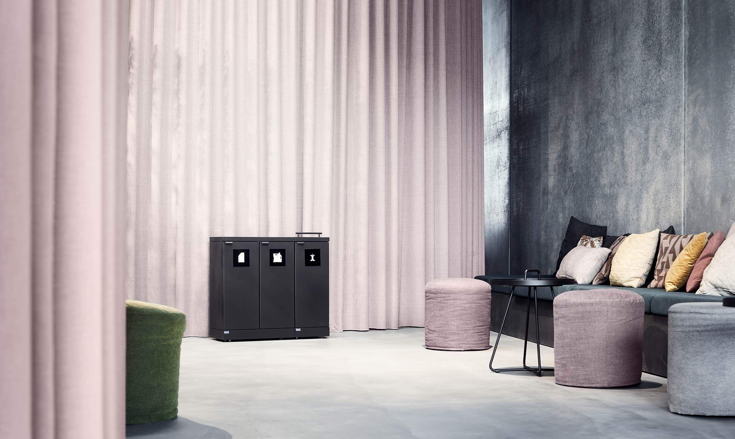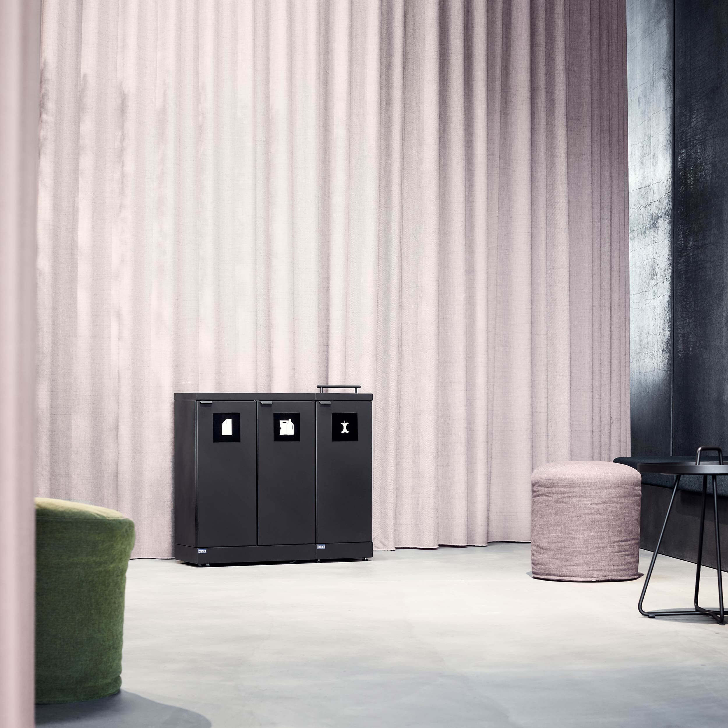 Das flexible Abfallsystem von Bica sorgt für eine einfache und benutzerfreundliche Abfalltrennung am Arbeitsplatz. Das Abfallsystem ist mit 3 Fraktionen ausgestattet, jeweils 2 offenen Öffnungen und 1 mit Deckel. Der Zweck des Deckels besteht darin, Geruchsbelästigungen zu minimieren und Bananenfliegen beim Sortieren von Lebensmittelabfällen vorzubeugen. Eine wirklich clevere Lösung, wenn der Beutel nicht sehr oft geleert wird.