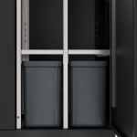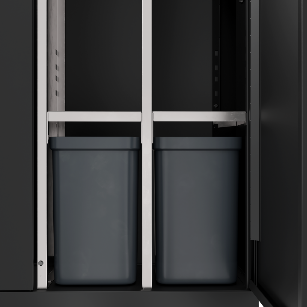 Das Abfallsystem ist mit Fronttüren mit Soft Close Funktion für eine ergonomisch korrekte Entleerung ohne schweres Heben ausgestattet. Das Abfallsystem ist mit integrierten und stabilen Beutelhaltern ausgestattet, sodass der Beutel an Ort und Stelle bleibt. Im Deckel ist ein Gasdämpfer eingebaut, der für ein geräuschloses und geräuschloses Schließen sorgt, außerdem verbirgt der Deckel die Beutel, sodass das Abfallsystem ein stilvolles Design behält. Mobil ist das Abfallsystem dank der montierten Räder, die hinter dem Sockel verborgen sind. Der Abfallbehälter wird mit einer magnetischen Wandhalterung geliefert, an der er befestigt werden muss.