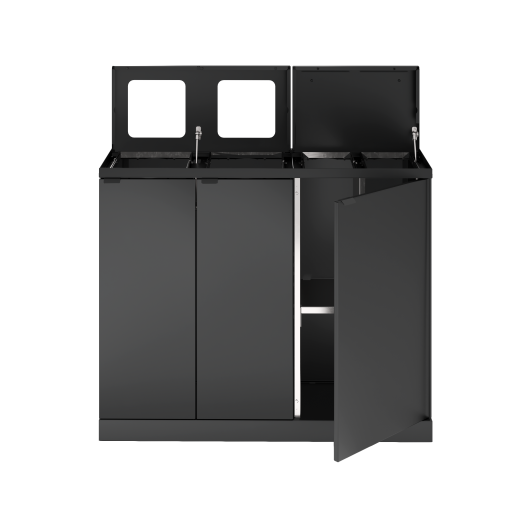 Das flexible Abfallsystem von Bica sorgt für eine einfache und benutzerfreundliche Abfalltrennung am Arbeitsplatz. Das Abfallsystem ermöglicht eine differenzierte Menge in einer integrierten Lösung, was praktisch ist, wenn Sie eine Sortierung in unterschiedlichen Mengen benötigen. In der Fraktion 2×45 Liter wurden Regale eingebaut, die es ermöglichen, Innenbehälter aus Kunststoff für scharfe Abfälle einzusetzen, wo der Beutel zerbrechen kann. Dieses Modell ist außerdem mit einem Hebedeckel für die 2×45 Liter Fraktion ausgestattet.