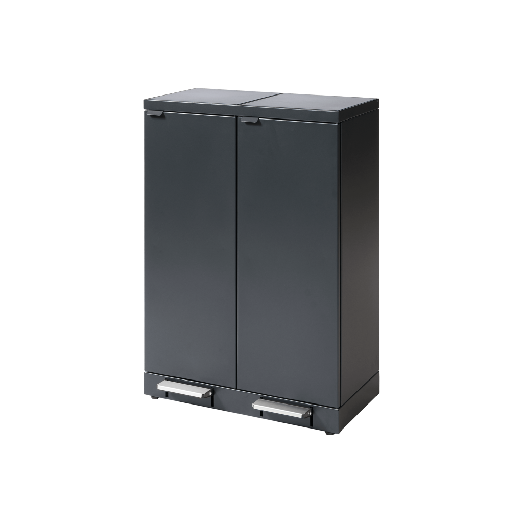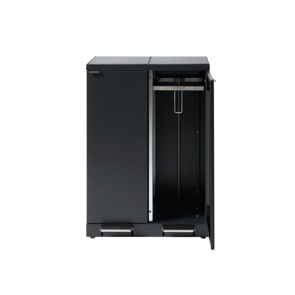 Das Abfallsystem ist mit Fronttüren mit Soft Close Funktion für eine ergonomisch korrekte Entleerung ohne schweres Heben ausgestattet. Das Abfallsystem ist mit integrierten und stabilen Beutelhaltern ausgestattet, damit die Beutel an Ort und Stelle bleiben. Im Deckel ist ein Gasdämpfer eingebaut, der für ein geräuschloses und geräuschloses Schließen sorgt, außerdem verbirgt der Deckel die Beutel, sodass das Abfallsystem ein stilvolles Design behält. Das Abfallsystem ist mit verstellbaren Füßen ausgestattet, die hinter dem Sockel versteckt sind.