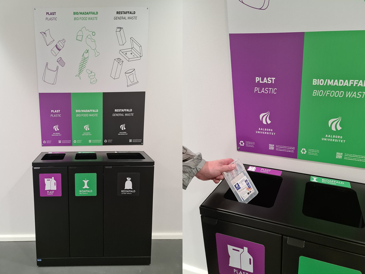 Seit 2020 und in den darauffølgende Jahren hat die Aalborg Universität schrittweise die neuen Abfalltrennungssysteme auf dem gesamten Campus eingeführt – beginnend am Campus Esbjerg, gefolgt vom Campus Aalborg und anschließend dem Campus Kopenhagen.