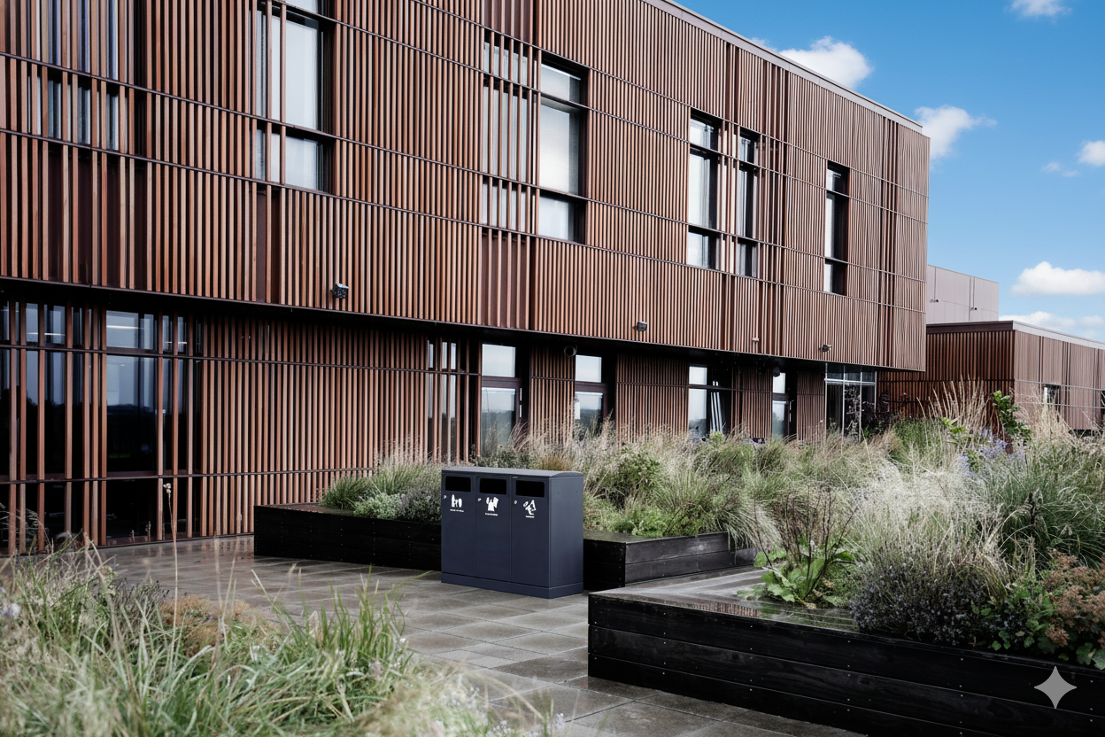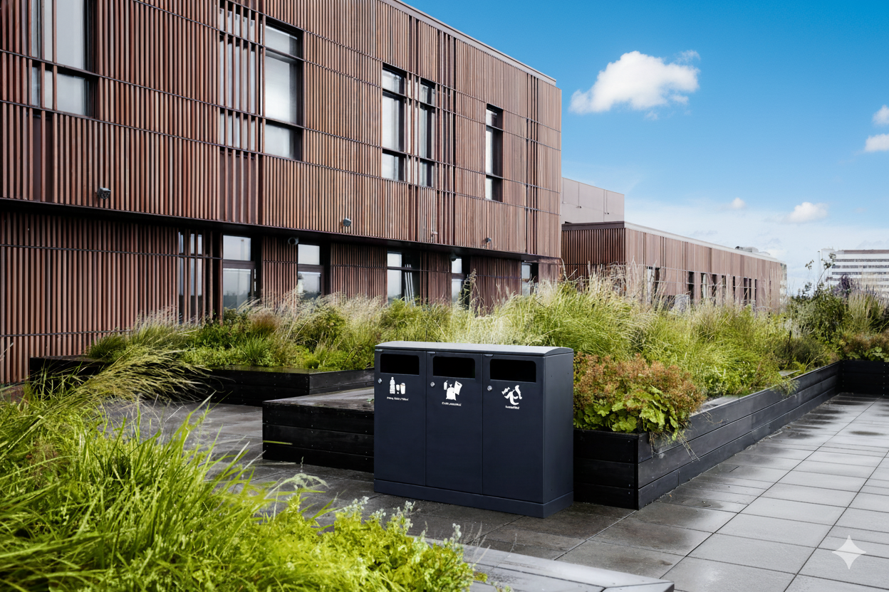 Das flexible Abfallsystem von Bica sorgt für eine einfache und benutzerfreundliche Abfalltrennung im Freien. Das Abfallsystem ist mit 3 Fraktionen und seitlichem Eingang für eine einfache Abfallsortierung ausgestattet. Es besteht die Möglichkeit, eine Metallklappe anzubringen, damit Vögel nicht in den Abfall gelangen. Das Abfallsystem verfügt über integrierte Beutelhalter, die herausgezogen werden können, wenn der Beutel gewechselt werden muss. Das Abfallsystem verfügt außerdem über Vordertüren zur einfachen Entleerung, die mit einem Schlüssel geöffnet werden können. Das Bica-Modell 713 ist mit anderen Bica-Modellen in gleicher Tiefe kombinierbar.