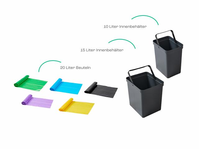 Für Innenbehältere mit 10 und 15 Litern Kapazität müssen Sie Beuteln mit 25 Litern verwenden.