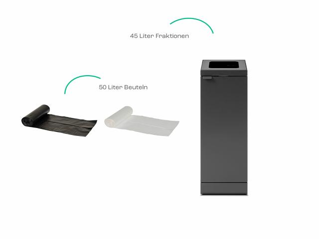 Für alle Fraktionen mit einem Kapazität von 45 Litern müssen Sie 50 Liter Beuteln verwenden.