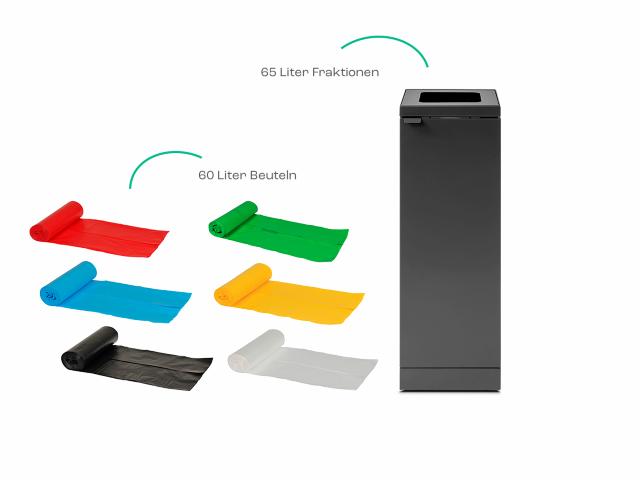 Für alle Fraktionen mit einem Kapazität von 65 Litern müssen Sie 60 Liter Beuteln verwenden.