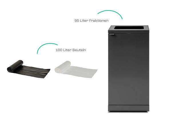 Für alle Fraktionen mit einem Kapazität von 95 Litern müssen Sie 100 Liter Beuteln verwenden.