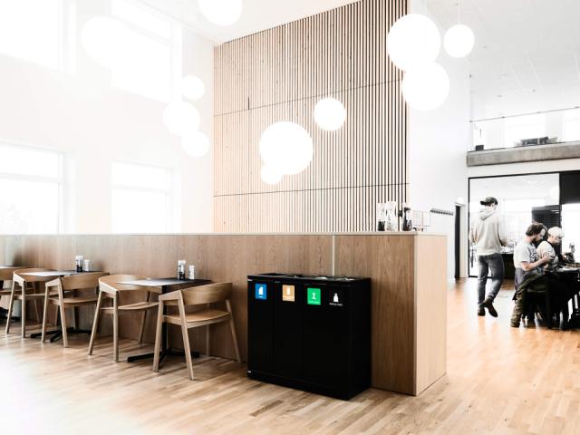 Das resultierte in einer flexiblen Innenraumlösung, die insgesamt betrachtet aus dem Modell 950 mit 4 Unterteilungen und dem Modell 870 mit 3 Unterteilungen in schwarzer Lackierung besteht. Dazu entschieden sie sich zum Kauf von 65-Liter-Innenbehältern und die Anwendung von selbstklebenden farbigen Piktogrammen. Die Lösung ist in allen Flurbereichen umgesetzt worden, in Besprechungsräumen und an den Kaffeeinseln, und sie ersetzt viele einzelne Mülleimer, die inzwischen aus dem Agro Food Park entfernt worden sind.